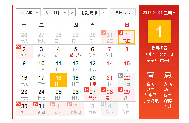 春節(jié)放假時(shí)間:2017/1/25(星期三)--2017/2/3(星期五)。